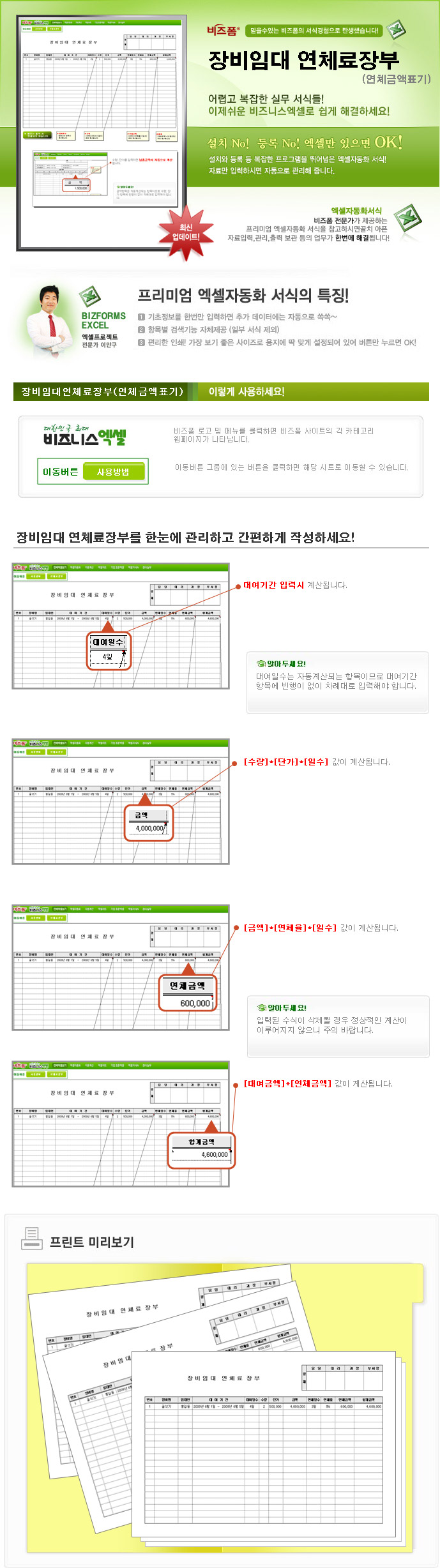 9,000원/월장비 대여일수에 대한 금액, 연체일에 대한 연체금액의 합계가 자동계산되는 서식입니다.