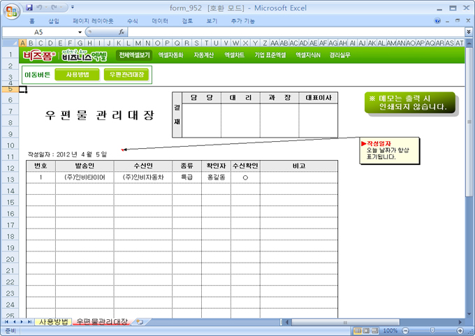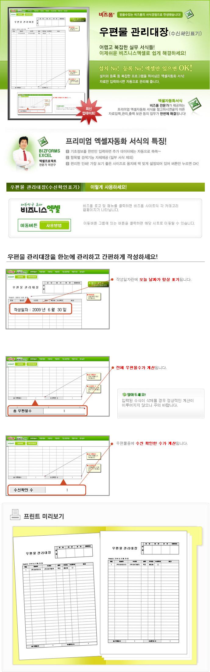 9,000원/월기업에 오는 중요 우편물에 대한 확인을 할때 사용하는 서식으로서 우편물의 수, 수신확인수 항목이 자동계산되는 서식입니다.