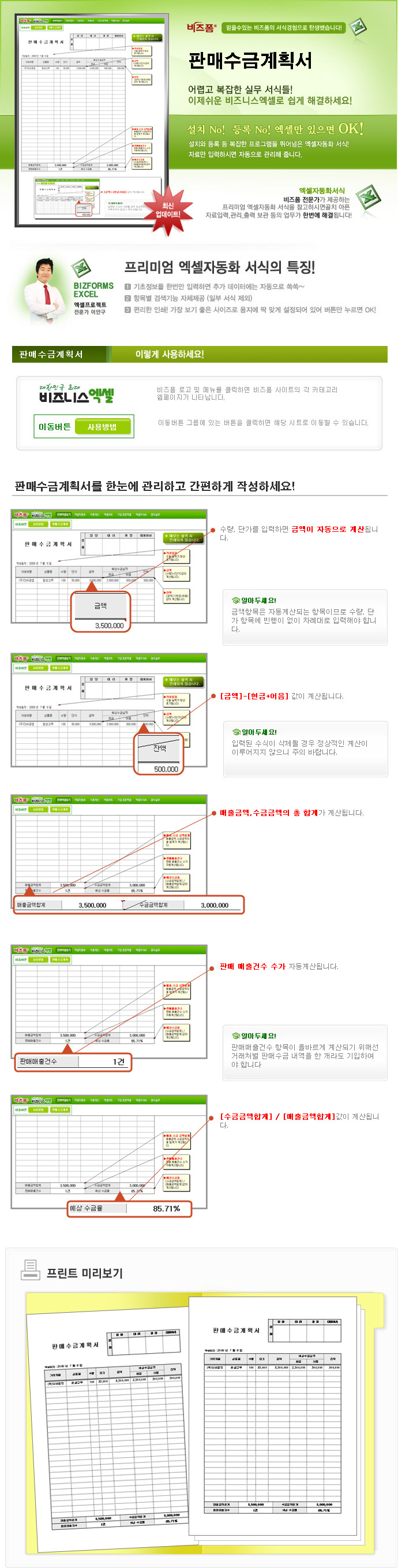 9,000원/월판매제품에 한 수량, 단가입력시 금액, 예상수금금액을 입력하면 잔액, 매출, 수금금액합계, 판매매출건수, 예상수금을이 자동계산되는 서식입니다.