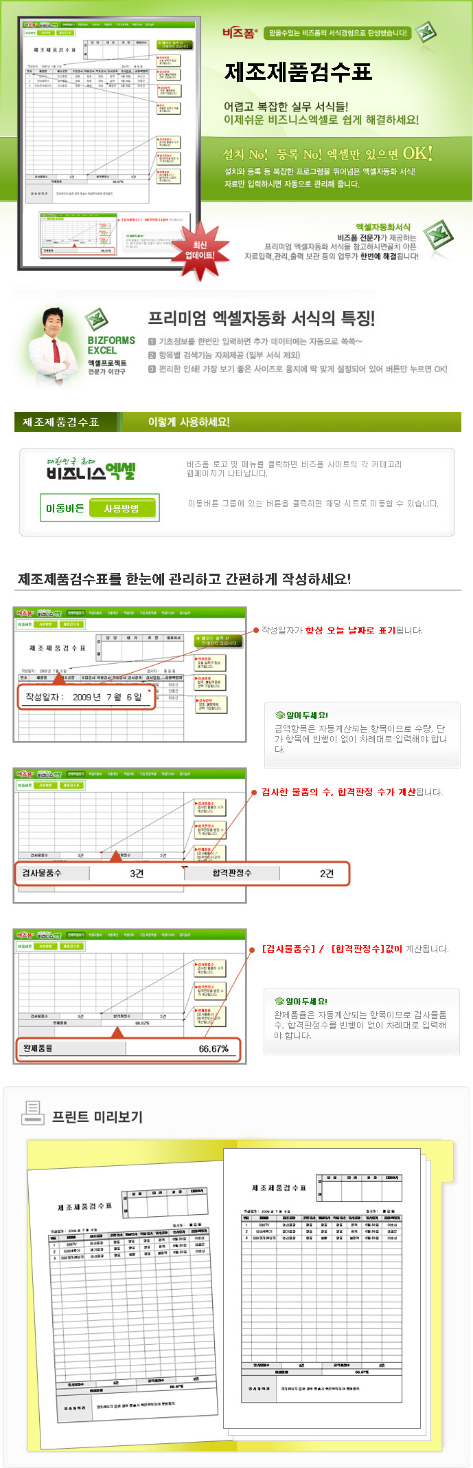 9,000원/월제조제품에 대한 검사 결과, 합격여부 입력시 검사물품수, 합격판정수, 완제품율이 자동계산되는 서식입니다.
