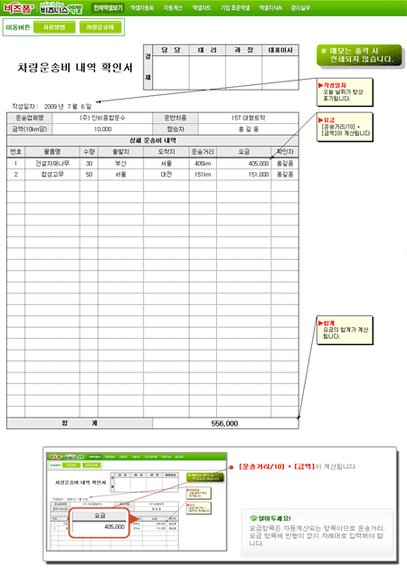 9,000원/월차량운송요금 입력시 거리별 금액, 총 운송금액의 합계가 자동계산되는 서식입니다.