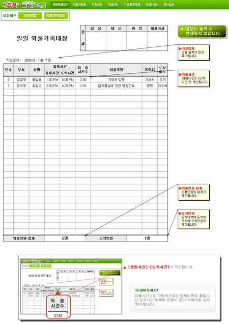 9,000원/월일일 외출 인원에 대한 수, 외출시간 수, 도착인원 수가 자동계산되는 서식입니다.