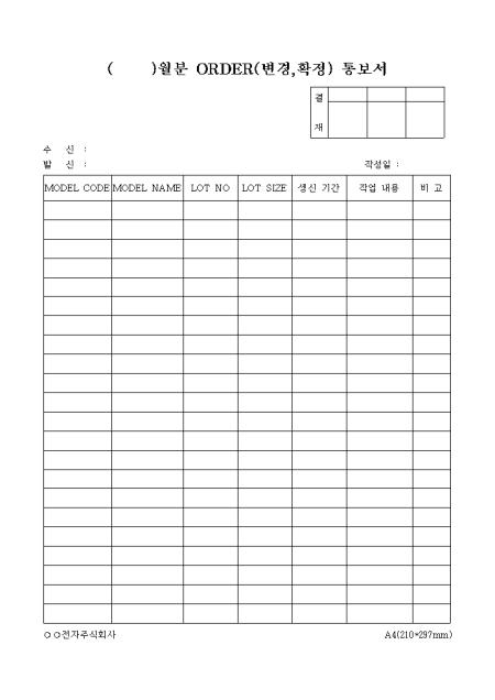 MODEL CODE,MODEL NAME,LOT NO,LOT SIZE,생산기간,작업내용으로 구성된 ORDER(변경,확정) 통보서입니다.