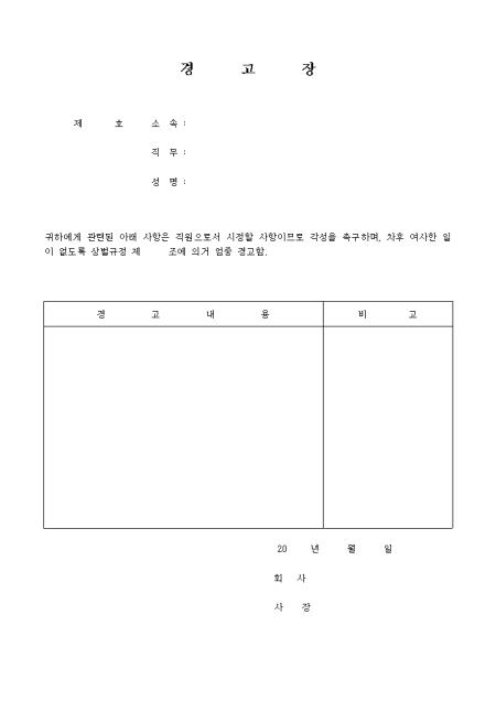 직원으로서 시정할 사항을 각성 촉구하며, 차후 여사한 일이 없도록 상벌규정에 의거 엄중히 경고할 때 사용하는 양식입니다.