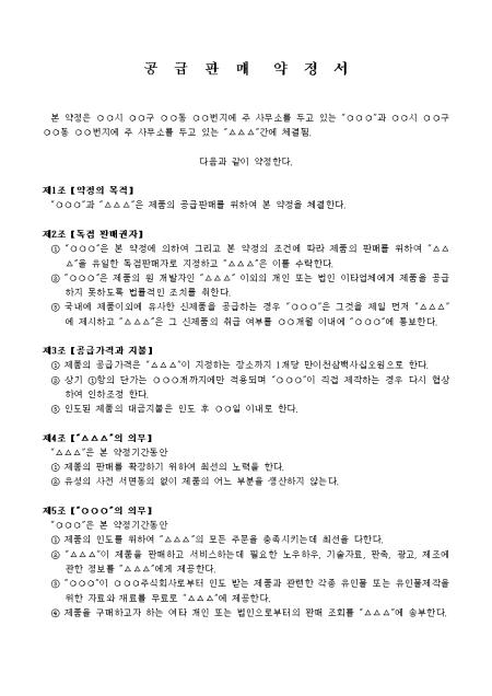 제품의 공급판매를 위한 약정체결시 사용하는 양식입니다. 모두 10개의 조항으로 구성되어 있습니다.