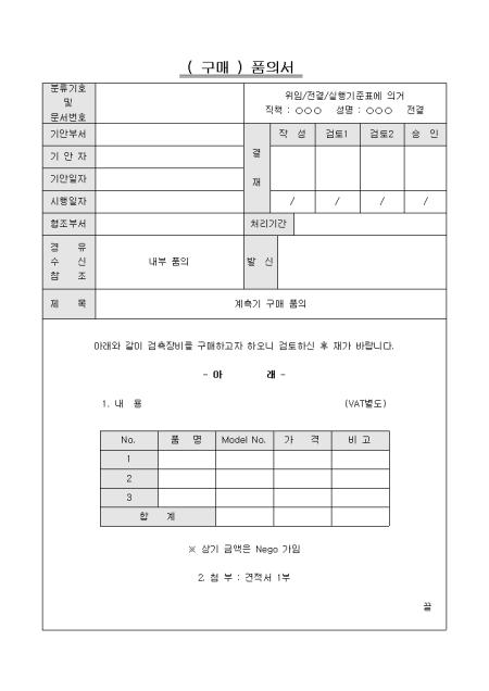 검측장비를 구매하고자 하여 이에 대한 자세한 사항를 적어 품의서를 제출하여 허가요청을 할 때 사용하는 양식입니다.