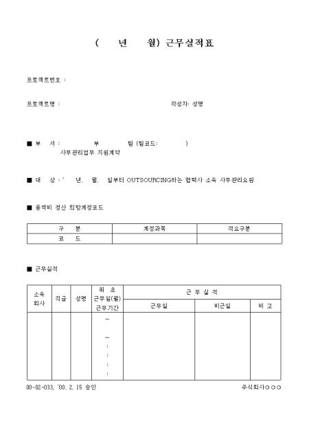프로젝트의 구성인원과 정산항목, 근무실적등을 기재하여 근무실적을 보고할 때 사용하는 양식입니다.