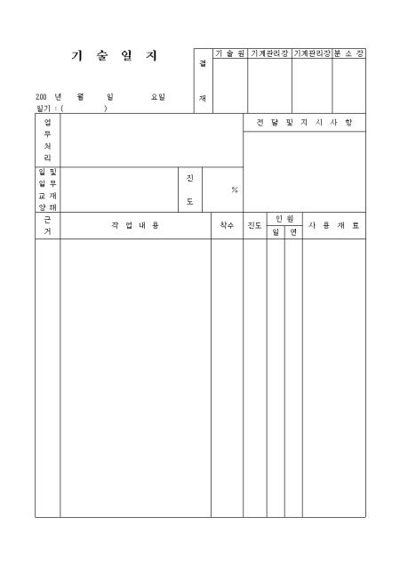 기술일지양식으로 업무처리, 작업내용, 인원, 사용재료등의 항목으로 구성되어 있습니다.