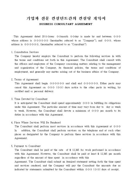 기업과 전문 컨설턴트간의 의무와 권리 등을 명시해 놓은 영문 컨설팅 계약서입니다.