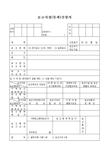 보고지정(통제)를 신청할 때 사용하는 양식으로 보고종류, 근거, 용도, 심사내용등의 항목으로 구성되어 있습니다.