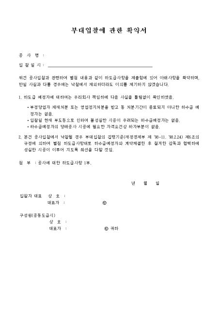 공사입찰과 관련하여 하도급사항을 제출함에 있어 기재한 사항을 확약할 것을 증명할 때 사용하는 양식입니다.