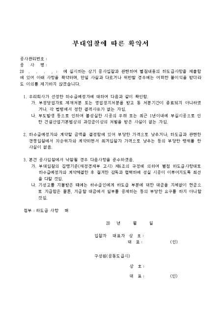 공사입찰과 관련하여 하도급사항을 제출함에 있어 기재한 사항을 확약할 것을 증명할 때 사용하는 양식입니다.