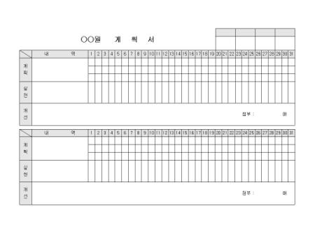 월내 날짜별 업무계회에 대한 내용과 실천내역, 개선사항들을 기록하는 양식입니다.