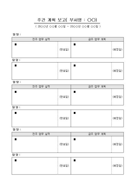 전주업무실적을 기재하고 이에 대한 금주업무계획을 보고하는 양식입니다.