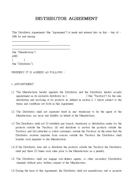 DISTRIBUTOR AGREEMENT양식입니다. 17개의 조항과 부칙이 등록이 되어 있습니다.