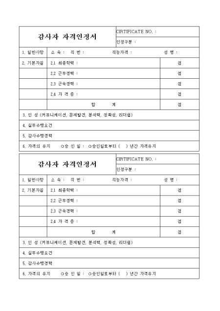 일반사항,기본자질,인성,실무수행요건,감사수행경력,자격의 유지를 기록하는 감사자 자격인정서입니다.