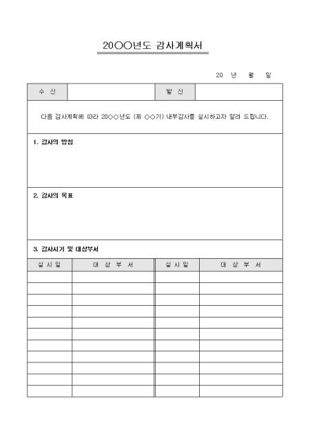 감사의 방침,감사의 목표,감사시기 및 대상부서를 기록하는 감사계획서입니다.