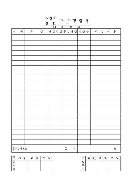 시간외 휴일의 근무 명령양식입니다. 시업시간, 종업시간, 시간수등을 기재하도록 되어 있습니다.