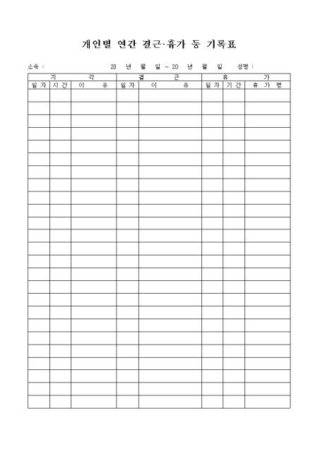 개인별로 연간 지각, 결근, 휴가등의 내역을 기재하는 양식입니다.