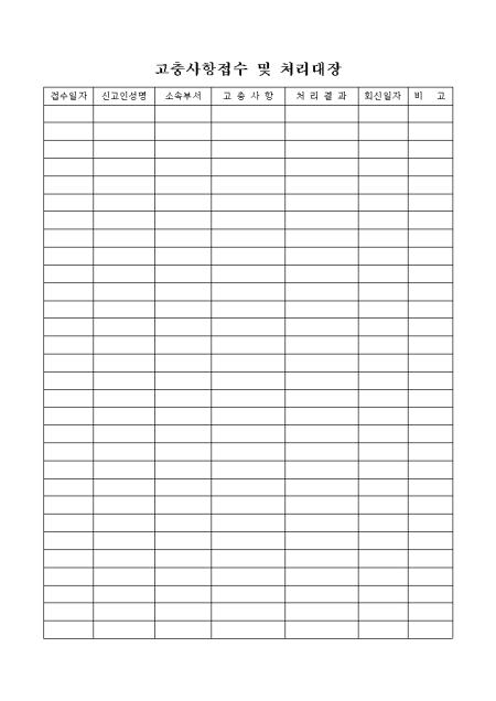 회사내의 고충사항을 접수하여 그 처리결과를 기록하는 양식입니다.