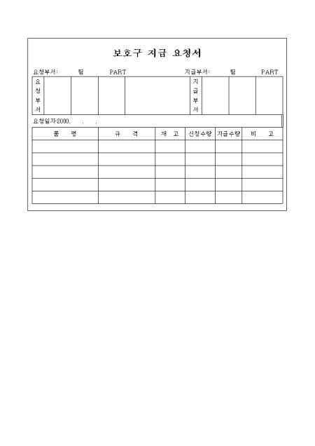 보호구의 지급을 요청할 때 사용하는 양식으로 품명, 규격, 재고, 신청수량, 지급수량등을 기재합니다.