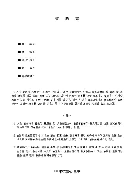 입사하여 재직중 상사의 정당한 지휘명령에 따르고 근로기준법 및 제규정을 준수할 것을 서약할 때 사용하는 양식입니다.