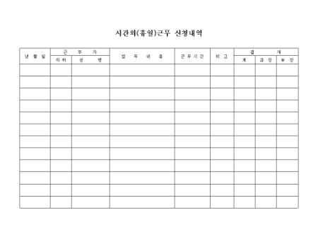 시간외 근무 신청내역을 기록하는 양식으로 근무자와 업무내용, 근무시간등을 기재하는 양식입니다.