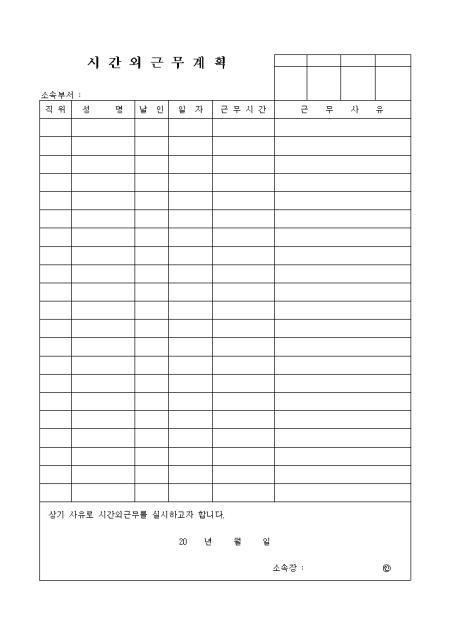 개인별 시간외 근무계획을 보고할 때 사용하는 양식입니다.