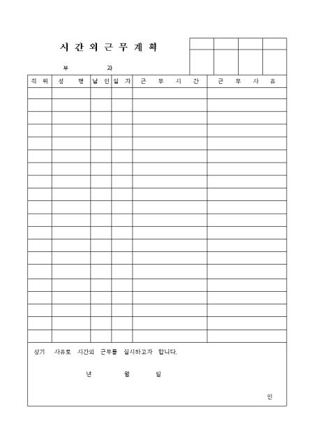 개인별 시간외 근무계획을 작성하는 양식입니다.