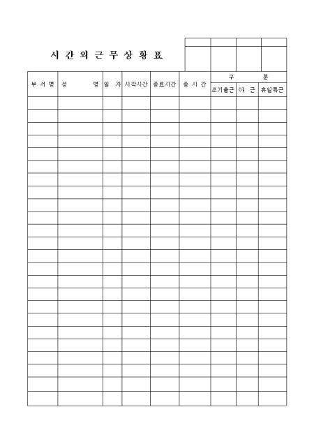 개인에 따라 시간외 근무 시작시간, 종료시간, 총시간, 형태등의 내역을 기재하는 양식입니다.