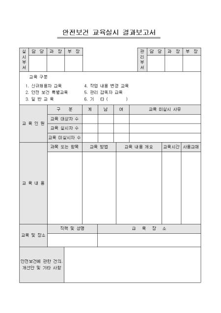 안전보건 교육실시에 대한 결과를 보고할 때 사용하는 양식으로 교육인원, 교육내용, 교육 및 장소등의 내용을 기재합니다.