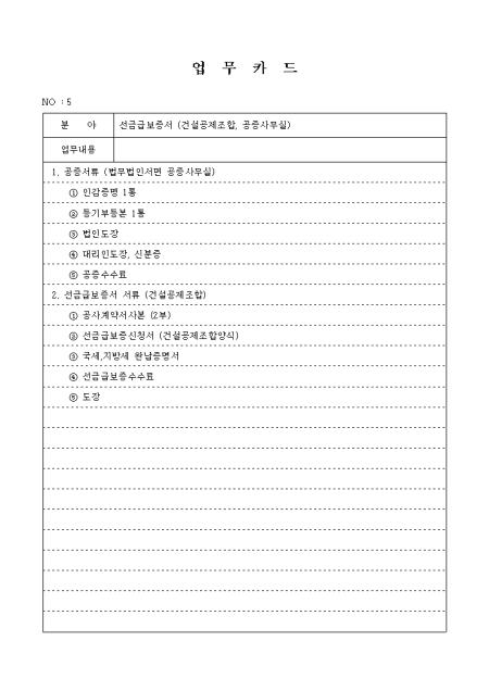 선금급보증서(건설공제조합, 공증사무실)에 고나한 업무카드 양식입니다.