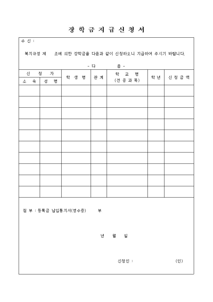 9,000원/월복지규정 의한 장학금 지급을 신청할 때 사용하는 양식입니다.