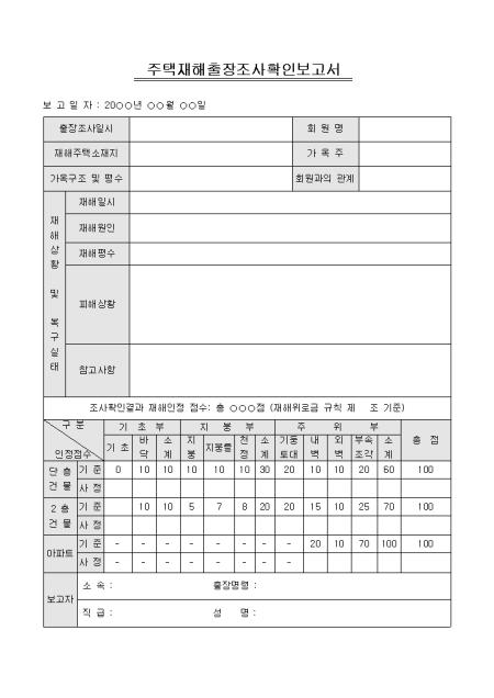 주택재해 출장조사 확인보고양식으로 재해주택소재지, 가옥구조 및 평수, 재해상황 및 복구실태조사확인결과등의 항목으로 구성되어 있습니다.