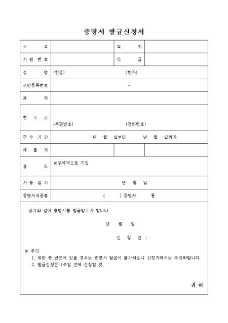 증명서 발급을 요청할 때 사용하는 양식입니다.