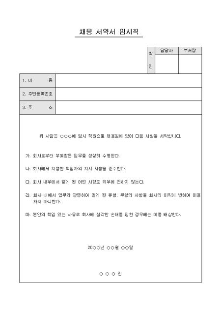 임시직 채용시 회사와 체결하는 서약서 양식입니다.(기재된 내용)