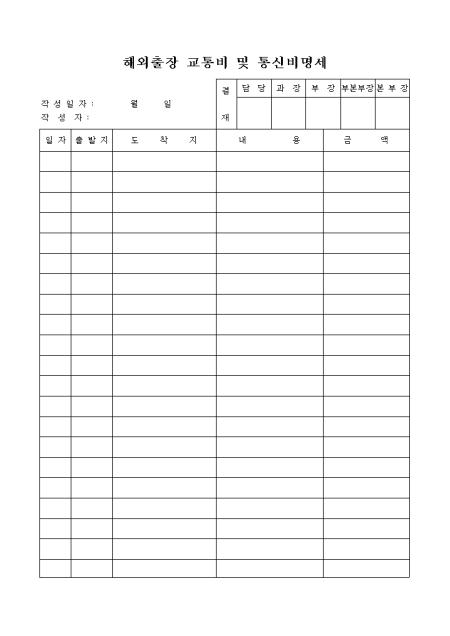 해외출장시 교통비와 통신비내역을 보고할 때 사용하는 명세서 양식입니다.