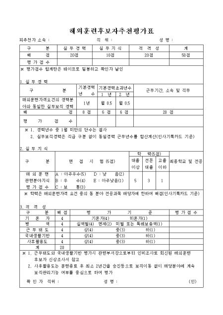 해외훈련 후보자의 추천 평가표양식입니다. 실무경력, 실무지식, 적격성등의 항목을 꼼꼼히 기재합니다.