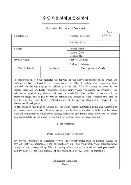수입화물선취보증신청서(Application For Letter of Guarantee)-영문 양식입니다.