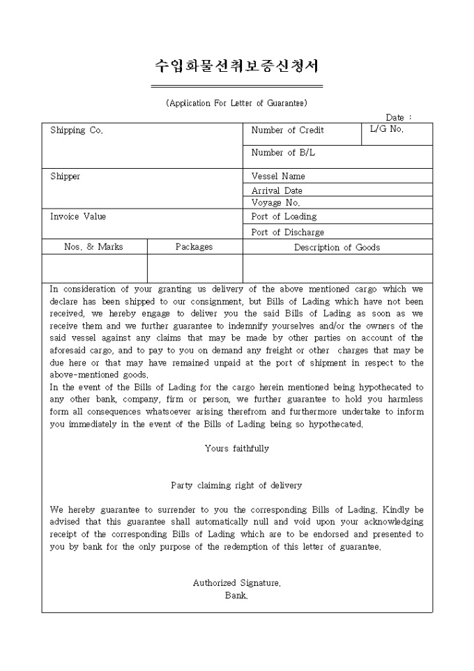 9,000원/월수입화물선취보증신청서(Application For Letter of Guarantee)-영문 양식입니다.
