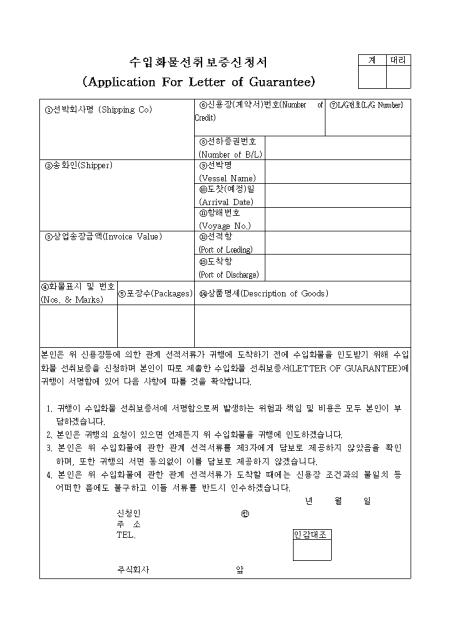수입화물을 인도받기 위해 수입화물 선취보증을 신청할때 사용하는 양식입니다.