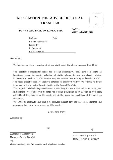 양도 통지서 발행 의뢰서(Total 양도)(APPLICATION FOR ADVICE OF TOTAL TRANSFER)양식입니다.