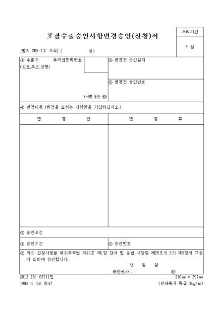 대외무역법 제19조 제1항 단서 및 동법 시행령 제25조의 2의 제3항의 규정에 의하여 포괄수출승인사항변경승인신청을 할때 사용하는 양식입니다.