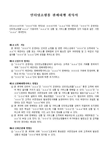 | 갑이 운영하는 인터넷 쇼핑몰 및 관련 서비스상에서 을의 고객에게 갑이 제공하는 상품 또는 서비스를 판매함에 있어 필요한 업무 처리방법 및 그 대금의 지급절차를 을과 갑간에 정함을 목적으로 하는 계약서입니다. | |