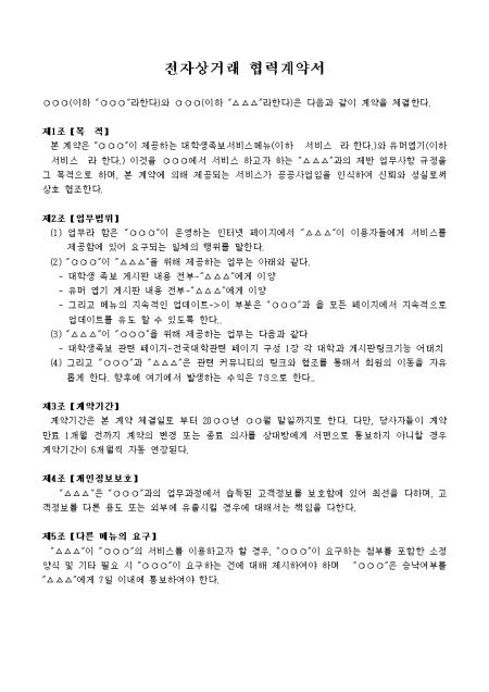 갑이 제공하는 대학생족보서비스메뉴(이하 서비스 라 한다.)와 유머엽기(이하 서비스 라 한다.) 이것을 갑에서 서비스 하고자 하는 을과의 제반 업무사항 규정을 그 목적으로 하며, 본 계약에 의해 제공되는 서비스가 공공사업임을 인식하여 신뢰와 성실로써 상호 협조하는 계약서입니다.