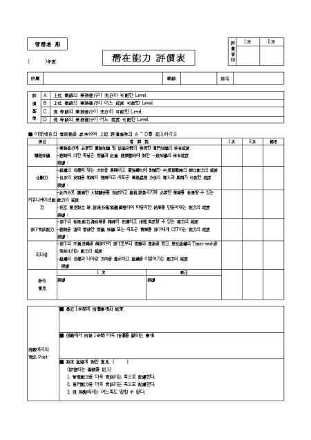 관리자용 잠재능력평가표로 한문으로 되어 있습니다. 다음과 같은 항목으로 되어 있습니다. 1.職務知識 2.企劃力 3.커뮤니케이션能力 4.部下育成能力 5.리더쉽