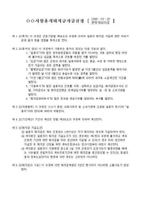 일용직퇴직금지급규정으로 아래의 항목으로 되어 있습니다. 1.목적 2.용어의 정의 3.적용범위 4.기간계산 5.퇴직금 지급요건 6.퇴직금의 시효 7.사무분장 등..