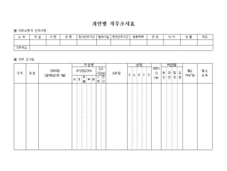 직무수행자 인적사항와 직무명,작업량,난이도,윔임전결,필요지식 기능 등을 기록하는 양식입니다.