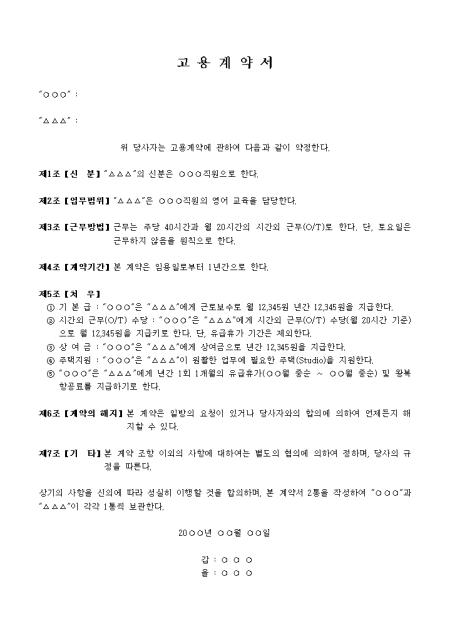 직원으로 고용함을 명시하고 기본급과 그외 처우에 대해 계약하는 고용계약서입니다. 제 1 조【신 분】