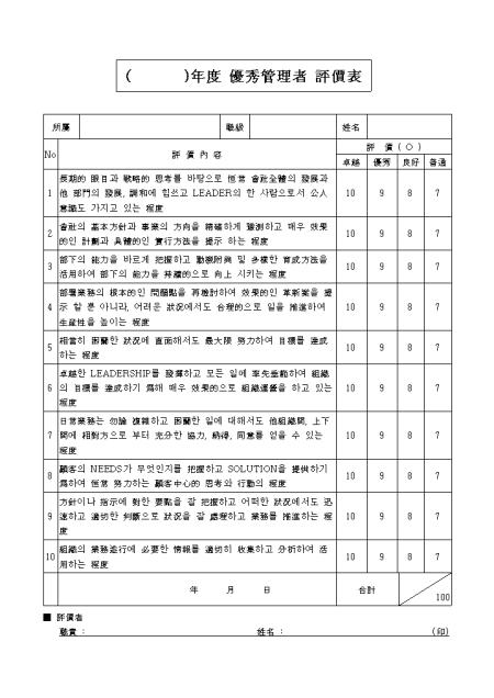 평가내용,평점으로 구성된 한문으로된 우수관리자평가표입니다.